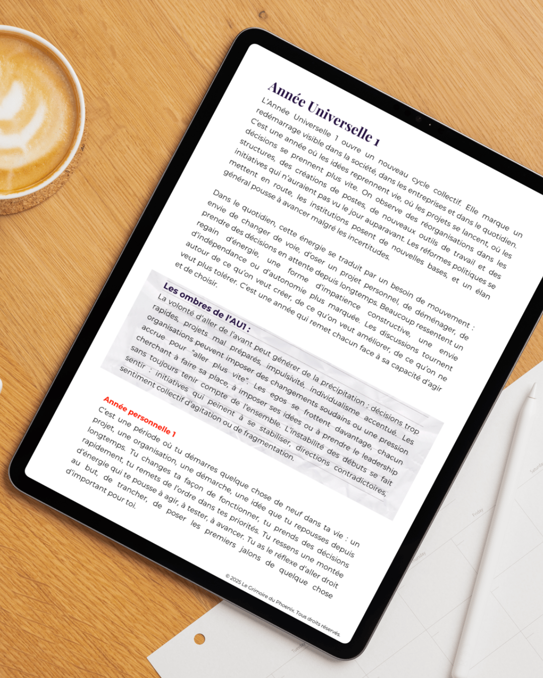 Ton année personnelle évolue dans un climat collectif précis. L’année universelle donne le ton général, crée des accélérations ou des résistances, et impacte la manière dont les opportunités se présentent. Le guide t’aide à comprendre cette interaction pour ajuster tes décisions au bon niveau de réalité, individuel et collectif.