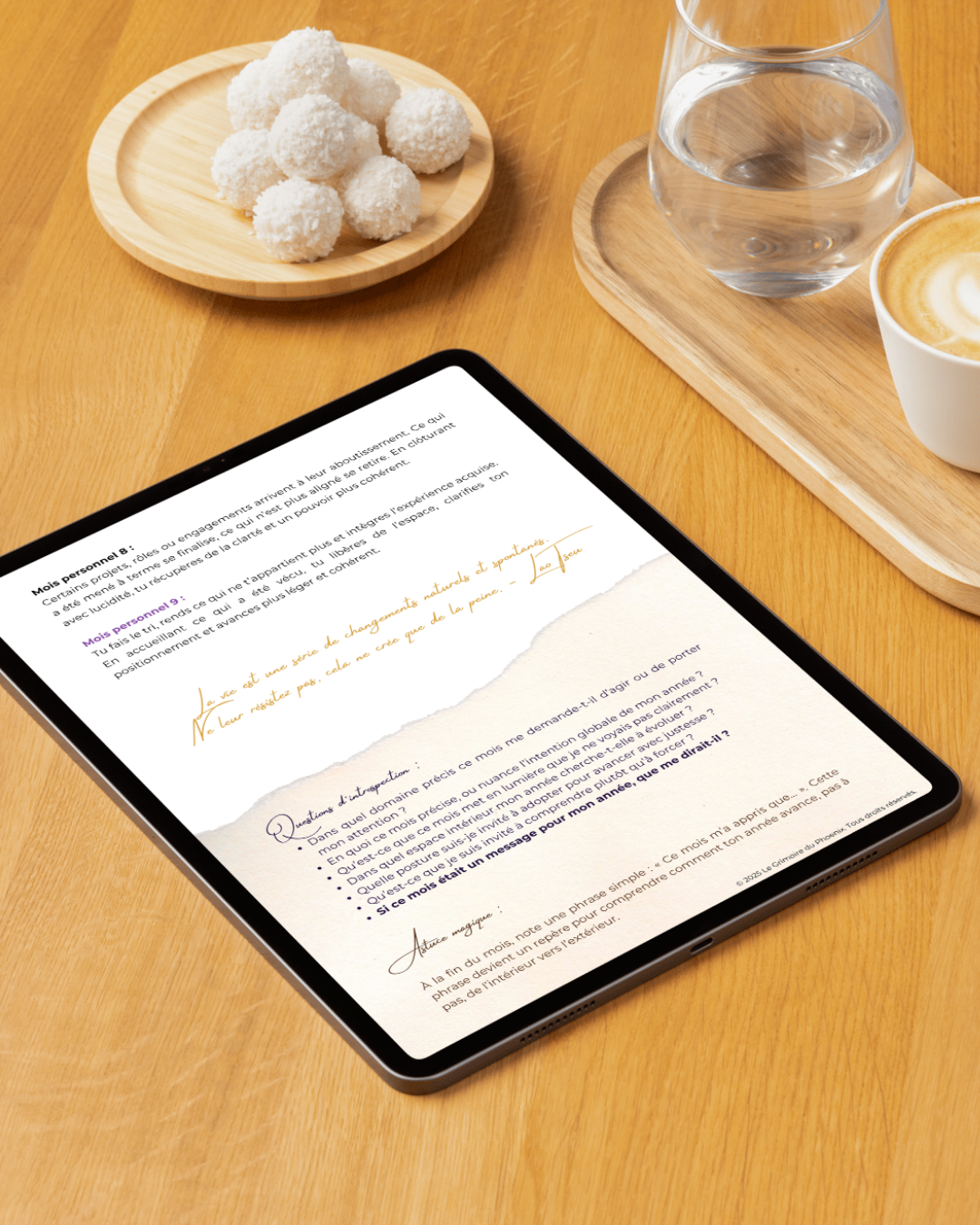 Chaque année personnelle et mois personnel est accompagnée de questions d’auto-coaching, de pistes de réflexion et d’outils d’ancrage concrets. Ces éléments servent à transformer la compréhension théorique en décisions claires, en ajustements quotidiens et en positionnement plus conscient face aux périodes plus exigeantes du cycle.